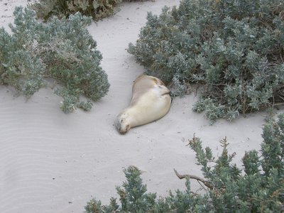 Am Morgen sind wir nach dem Frühstück gleich losgefahren um uns weiterem Geviech zu witmen. Wir fuhren den gleichen Weg wieder gegen Westen, allerdings diesmal nur bis zur Mitte der Insel. An der Seal Bay, wo sie natürlich wieder Eintritt wollten, konnte man über einen Holzsteg eine Seehundkolonie besichtigen. Die Viecher lagen gleich faul rum, wie ihre Kumpels vom Vortag. Allerdings waren ein paar mehr zu sehen.