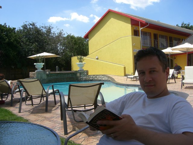 Nach dem Frühstück sind wir dann nochmals ins Bett und haben um elf Uhr den Zimmerschlüssel abgegeben. Danach sind wir bis drei Uhr am Pool gesessen, haben gelesen und Cola geschlürft. Dabei konnten wir ein echtes Teamwork beobachten. Drei 'Handwerker' haben begonnen die Platten um den Pool aufzuspitzen. Das heist einer hat gehämmert und zwei haben fachmännisch zugeschaut. TEAM - Toll Ein Anderer Machts