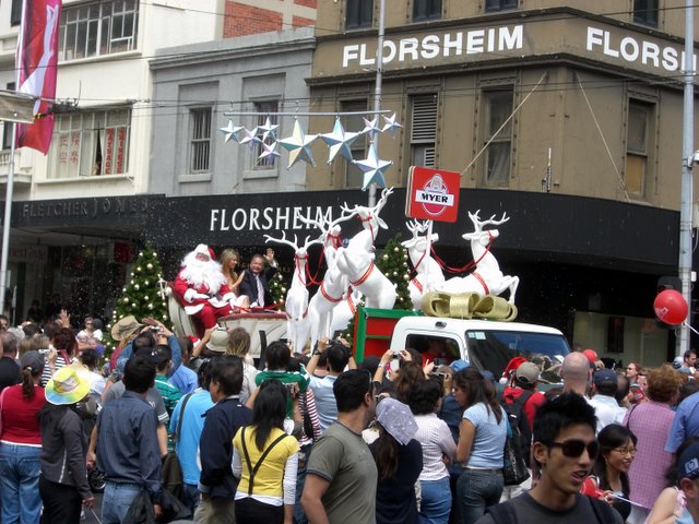 Plötzlech het sech ei Umzugswage nachem angere i Bewegig gsetzt. Zwüschdüre si immer ume Blaskappäuene cho, wo äs gmisch us moderner Musig u Wiehnachtlieder gspiut hei. Z ersch hei mer z Gfüuh gha, dass das dr Uftakt vor Fasanacht isch, aber wo de di Lüt uf de Wäge immer ume Merry Christmas grüeft hei, si mer de vo dere Idee abcho. Igentlech wüsse mer immer no nid rächt, was das ganze isch gsi, ob äs ize eifach ä Wiehnachtsumzug isch gsi, oder was. Wüu zwüschdüre het äs de Wäge gha mit de Turtles, ä Gospelchor, Ballerinas, Karaoke usw. Im letschte Wage isch de ömu dr Wiehnachtsma gsi, i vouer Montur, schwitz!! Mir hei üs de när nüme witer gfragt, wüu i gloube, dass mer nid drus wäre cho. Louft äbe immer no da aues ä chli verchehrt